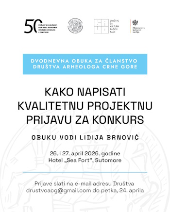 Društva arheologa Crne Gore i Društva za kulturni razvoj „Bauo“, obavještavaju da je otvoren poziv za učešće na drugoj dvodnevnoj besplatnoj obuci za članstvo Društva arheologa Crne Gore pod nazivom „Kako napisati kvalitetnu projektnu prijavu za konkurs“, koju će voditi Lidija Brnović.