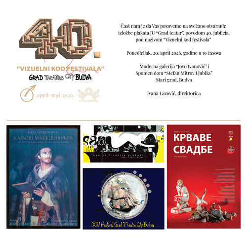 U poneđeljak  20. aprila, sa početkom u 19 časova, u Modernoj galeriji “Jovo Ivanović” i Spomen domu „Stefan Mitrov Ljubiša” u Starom gradu biće otvorena izložba plakata JU “Grad teatra”, organizovana povodom 40. jubileja festivala pod nazivom “Vizuelni kod festivala”. Autor izložbe je Merin Smailagić, dugogodišnji dizajner JU „Grad teatar“.
