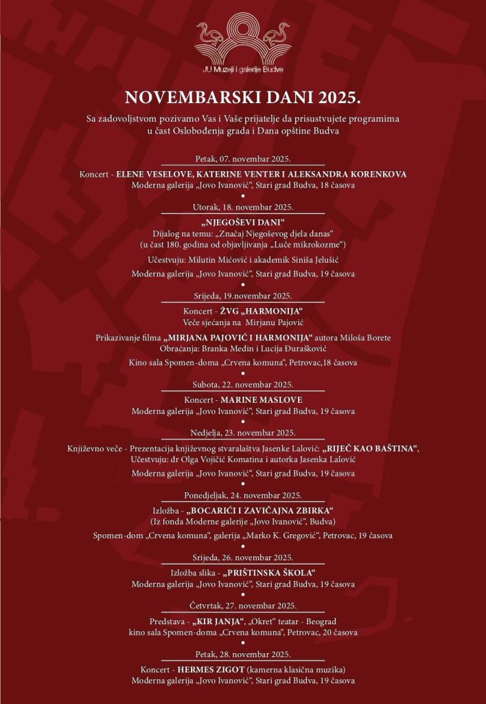 Manifestacija „Novembarski dani 2025.ˮ – je tradicionalni kulturni program u čast Oslobođenja grada i Dana opštine Budva. Tokom cijelog mjeseca novembra biće realizovan niz koncerata, književnih večeri, izložbi i drugih kulturnih sadržaja na više lokacija u Budvi i Petrovcu.
