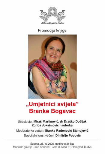 U organizaciji JU Muzeji i galerije Budve, u subotu, 26. jula sa početkom u 21 čas u Modernoj galeriji „Jovo Ivanović” u Starom gradu u Budvi biće održana promocija knjige „Umjetnici svijetaˮ autorke Branke Bogavac.