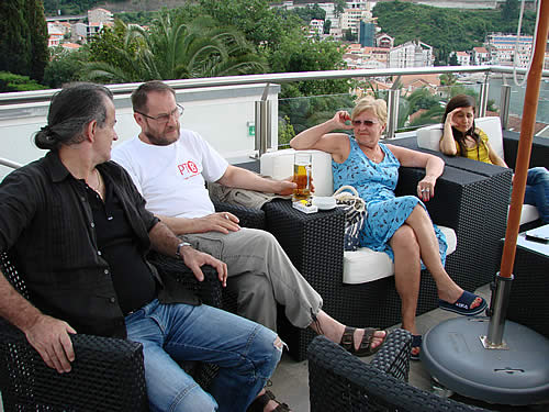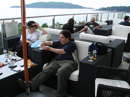 Vrijeme uobičajeno za odmor i kaficu. Upoznajemo se sa jednim dijelom učesnika kolonije na terasi hotela odakle se pruža nezaboravan pogled na bečićku plažu. Uživamo u pogledima i predivnom druženju.